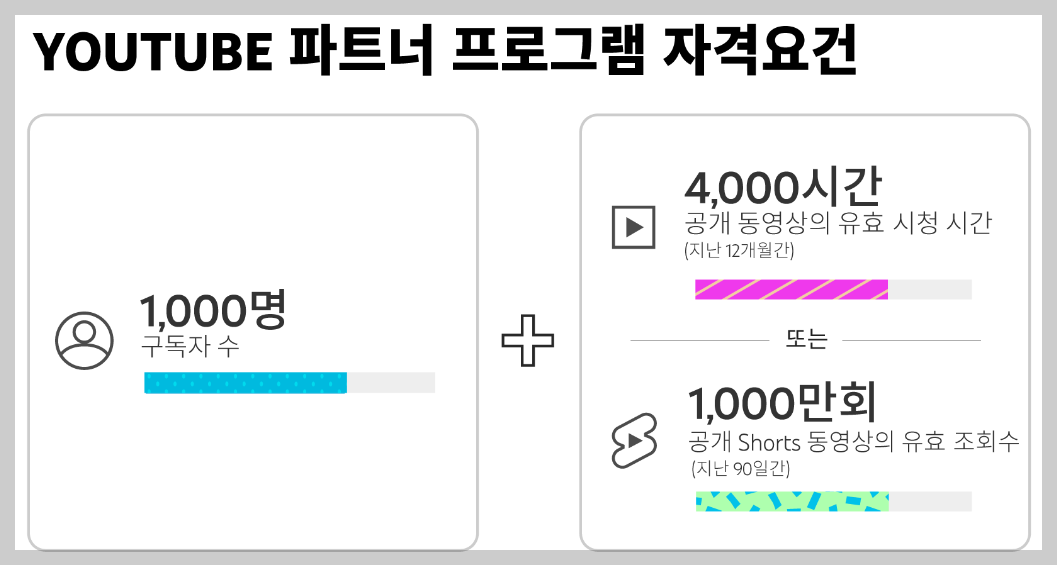 - 시청 시간 : 최근 12개월 동안 4,000시간 이상의 공개 비디오 시청 시간 또는 최근 90일 동안 1,000,000회의 공개 쇼츠 조회수