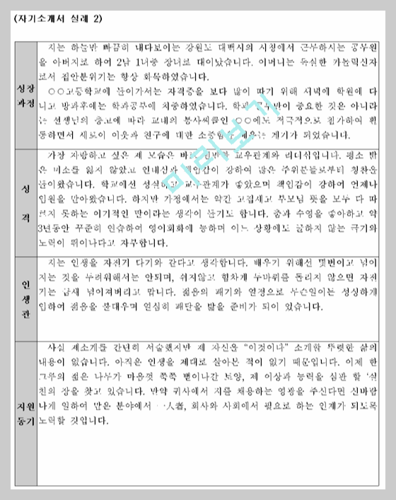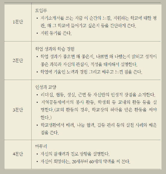 - 개인적 특성 : 자신의 성격, 가치관 및 특정 경험을 소개합니다. 이 섹션에서는 지역 사회 활동이나 과외 활동도 언급할 수 있습니다.