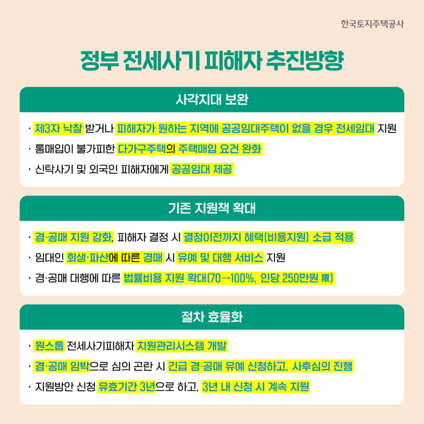 정부는 전세 사기를 예방하고 피해자를 지원하기 위해 다양한 제도를 운영하고 있습니다. 예를 들어, 전세 사기 피해자 지원 관리 시스템을 통해 피해자에게 필요한 정보를 제공하고 있습니다. 또한, 전세 사기 피해자에게는 주택 지원 및 금융 지원을 통해 피해 회복을 돕고 있습니다.