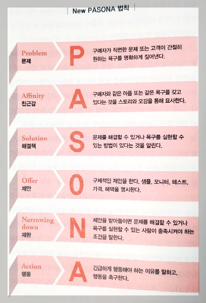 파소나 법칙(PASONA Law)은 일본의 마케팅 전문가 간다 마사노리(Kanda Masanori)가 개발한 기법으로, 고객의 마음을 사로잡고 매출을 향상시키기 위해 사용됩니다. 이 법칙은 고객이 직면한 문제를 이해하고 그에 대한 해결책을 제시하여, 고객의 행동을 유도하는 데 중점을 둡니다. 파소나 법칙을 적용하면 자연스럽게 고객과의 친근감을 형성하고, 고객의 신뢰를 얻을 수 있습니다.