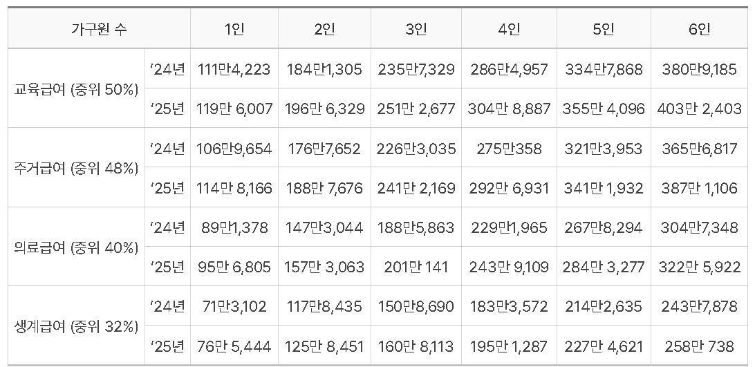 이 표를 통해 가구원 수에 따른 지원 금액을 쉽게 비교할 수 있습니다.