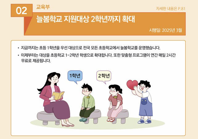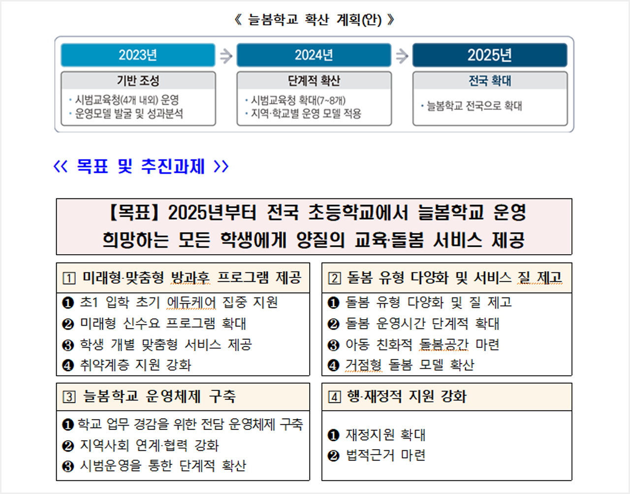 늘봄학교는 정규 수업 외에 다양한 교육 자원을 활용하여 학생들에게 맞춤형 교육을 제공하는 프로그램입니다. 2025년부터는 초등학교 1학년뿐만 아니라 2학년 학생들도 지원받을 수 있게 됩니다. 이는 교육부의 정책 변화로, 학생들이 보다 다양한 경험을 할 수 있도록 돕기 위한 것입니다.