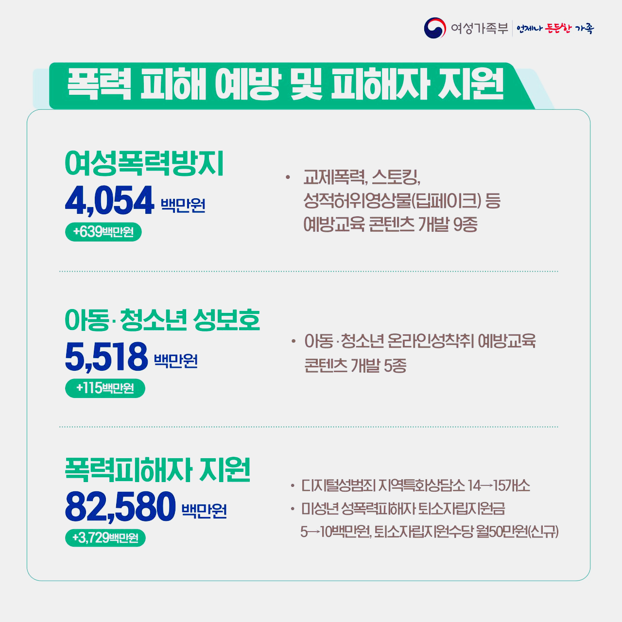 청소년 보호를 위한 다양한 프로그램이 마련되고 있습니다. 예를 들어, 청소년 폭력 예방을 위한 교육 프로그램과 피해자 지원 프로그램이 강화되고 있습니다. 2025년에는 청소년과 청소년 보호를 위한 예산이 5,518억 원으로 증가할 예정입니다.
