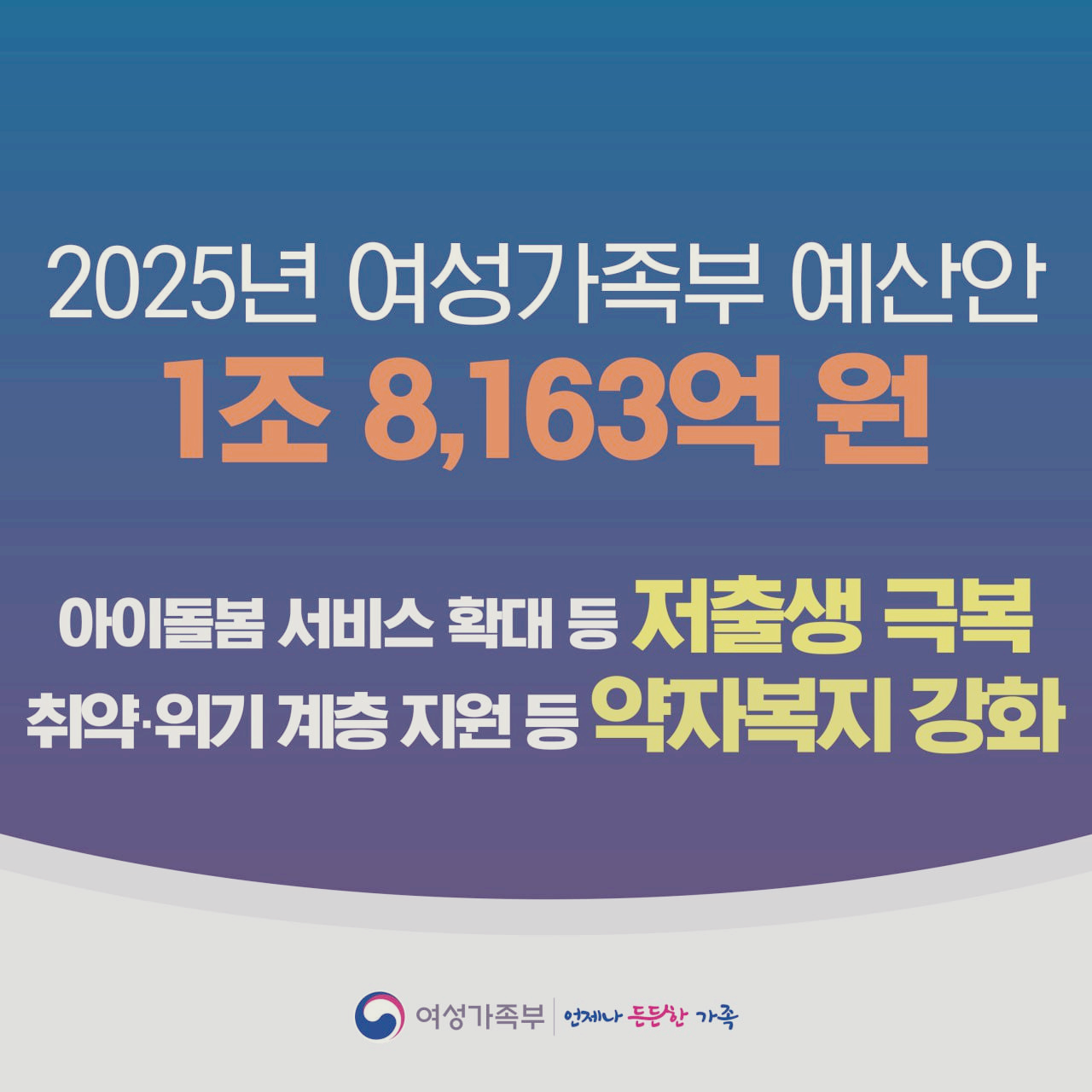 여성가족부는 2025년 청소년 복지 예산으로 1.8163조 원을 책정하였습니다. 이 예산은 주로 돌봄 지원, 저출생 극복, 취약 가족 및 청소년 보호, 폭력 피해 예방 및 피해자 지원에 사용될 예정입니다. 이러한 정책은 청소년들이 안전하게 성장할 수 있는 환경을 조성하는 데 기여할 것입니다.