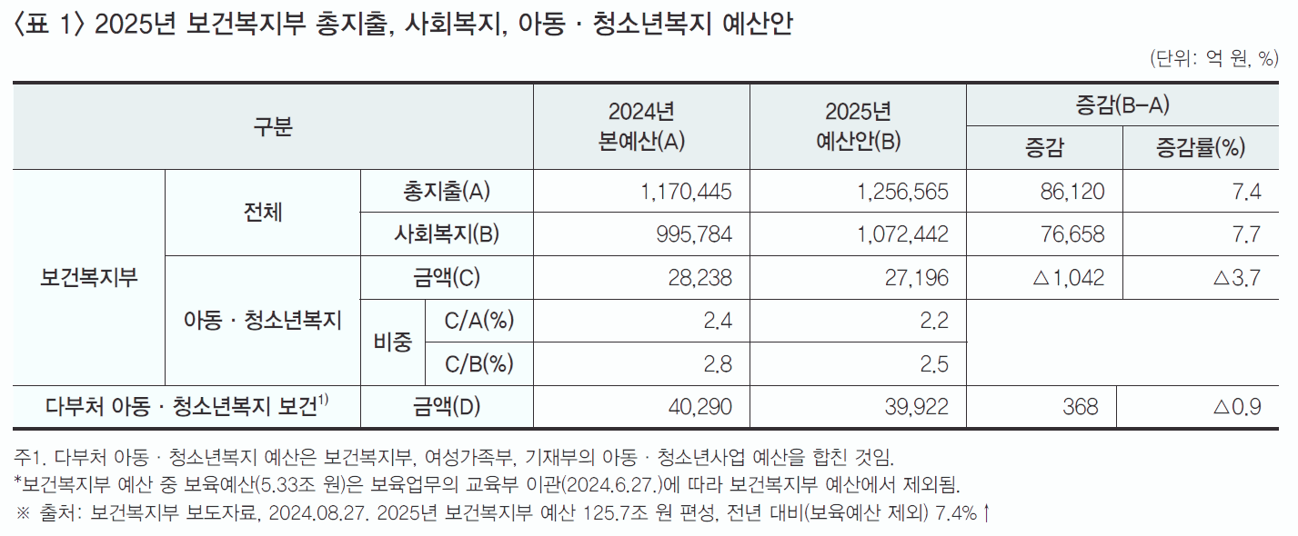 2025년 보건복지부의 예산안은 총 125조 6,565억 원으로, 청소년 복지 분야에 대한 예산도 포함되어 있습니다. 특히 아동 및 청소년 복지 예산은 매년 증가하고 있으며, 2025년에는 더욱 확대될 예정입니다. 아래의 표는 2024년과 2025년의 예산 비교를 보여줍니다.