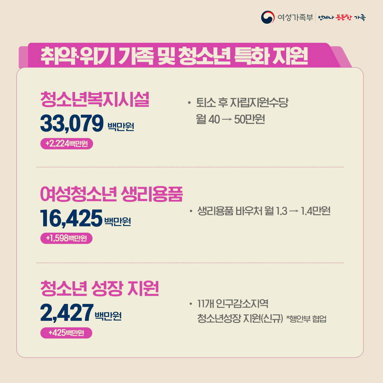 또한, 청소년 복지 시설에 대한 지원도 확대됩니다. 청소년 복지 시설에 대한 예산은 33,079억 원으로, 이는 청소년들이 안전하게 생활할 수 있는 공간을 제공하는 데 중요한 역할을 할 것입니다.